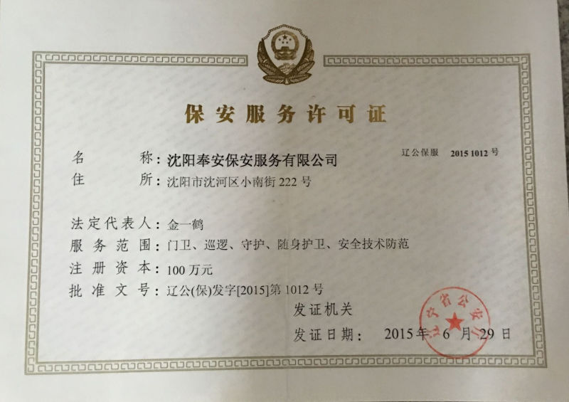 沈陽奉安保安服務有限公司(原沈陽市沈河區(qū)保安服務公司)創(chuàng)建于一九八八年八月,是遼寧省公安廳、沈陽市公安局批準,工商行政部門登記注冊,全市首家具備保安資質的特殊性服務企業(yè),隸屬于沈陽市沈河區(qū)政府直管的全民國有企業(yè),現為中國保安協會會員單位和省保協、市保協常務理事單位:在全市同行業(yè)中率先通過ISO國際質量認證,是市工商局批準的“重合同守信用”免檢單位和沈陽市政府采購中心保安服務項目重點競標單位;擁有一支專業(yè)化、標準化、職業(yè)化的高素質保安隊伍,是公安機關重要的輔警力量。